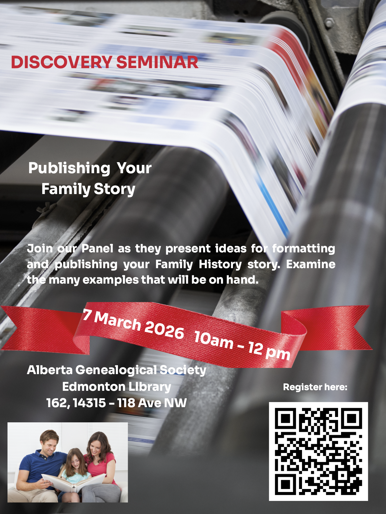 Discovery Seminar Publishing Your Family Story Saturday, March 7, 202610:00 am - 12:00 pmIn PersonAlberta Genealogical Society Edmonton Library 162, 14315 - 118 Ave NW |